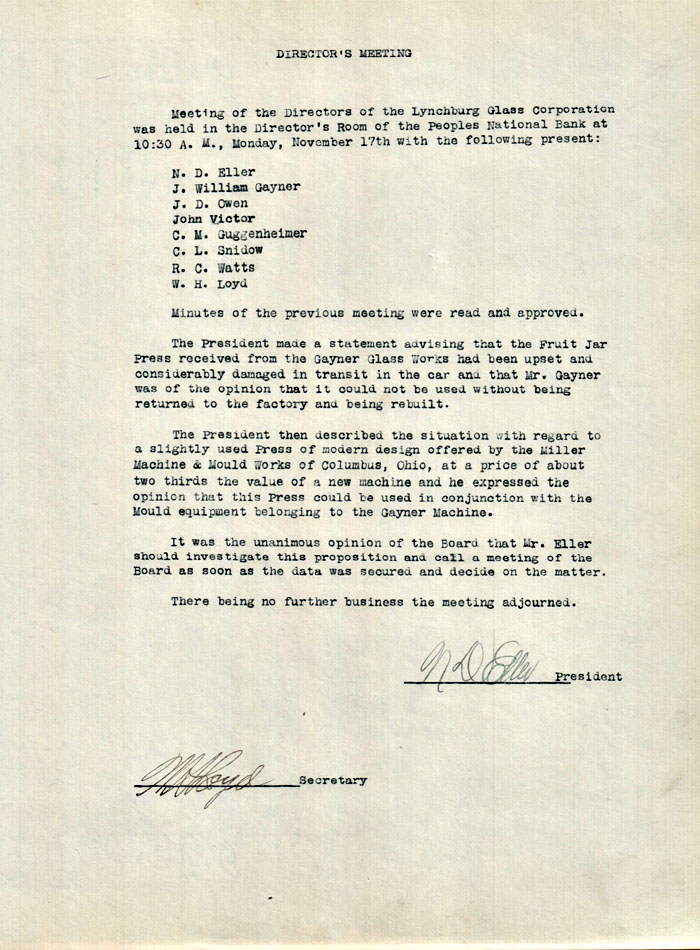Meeting of the Directors of the Lynchburg Glass Corporation was held in the Director's Room of the peoples National Bank at 10:30 A. M., Monday, November 17th [1924] with the following present: