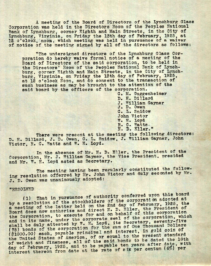 A meeting of the Board of Directors of the Lynchburg Glass Corporation was held in the Directors Room of the Peoples National Bank of Lynchburg, corner Eighth and Main Streets, in the City of Lynchburg, Virginia, on Friday the 13th day of February, 1925, at 12 o'clock, noon, which meeting was held in pursuance of a waiver of notice of the meeting signed by all of the directors as follows: