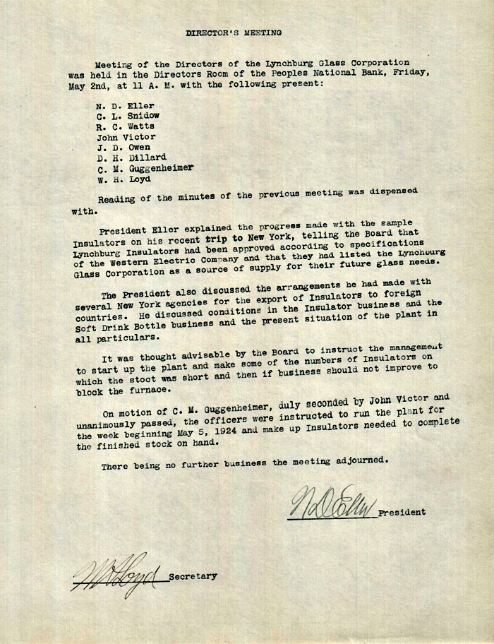 President Eller explained the progress made with the sample Insulators on his recent trip to New York, telling the Board that Lynchburg Insulators had been approved according to specifications of the Western Electric Company and that they had listed the Lynchburg Glass Corporation as a source of supply for their future glass needs.