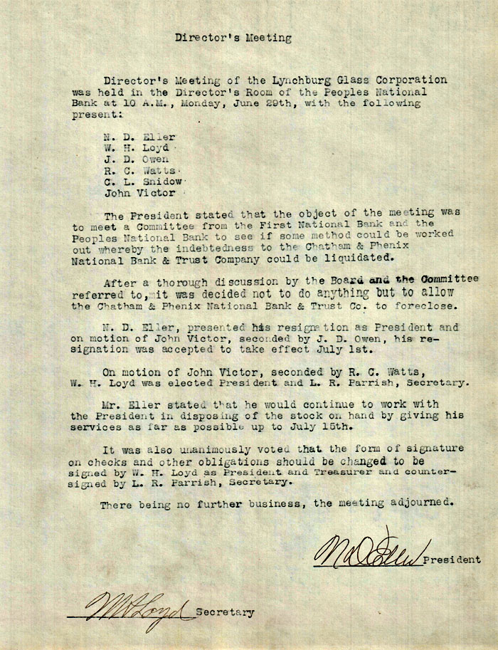 Director's meeting of the Lynchburg Glass Corporation was held in the Director's Room of the Peoples National Bank at 10 A.M., Monday, June 29th, [1925] with the following present