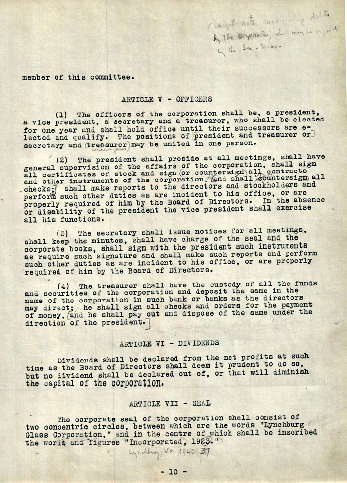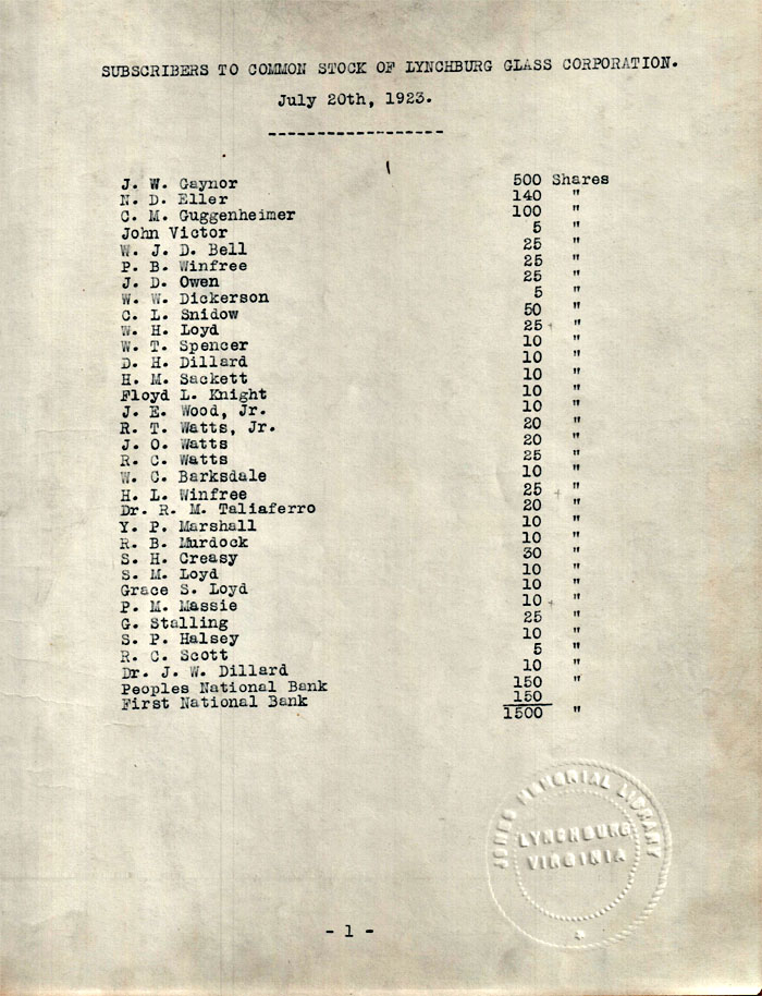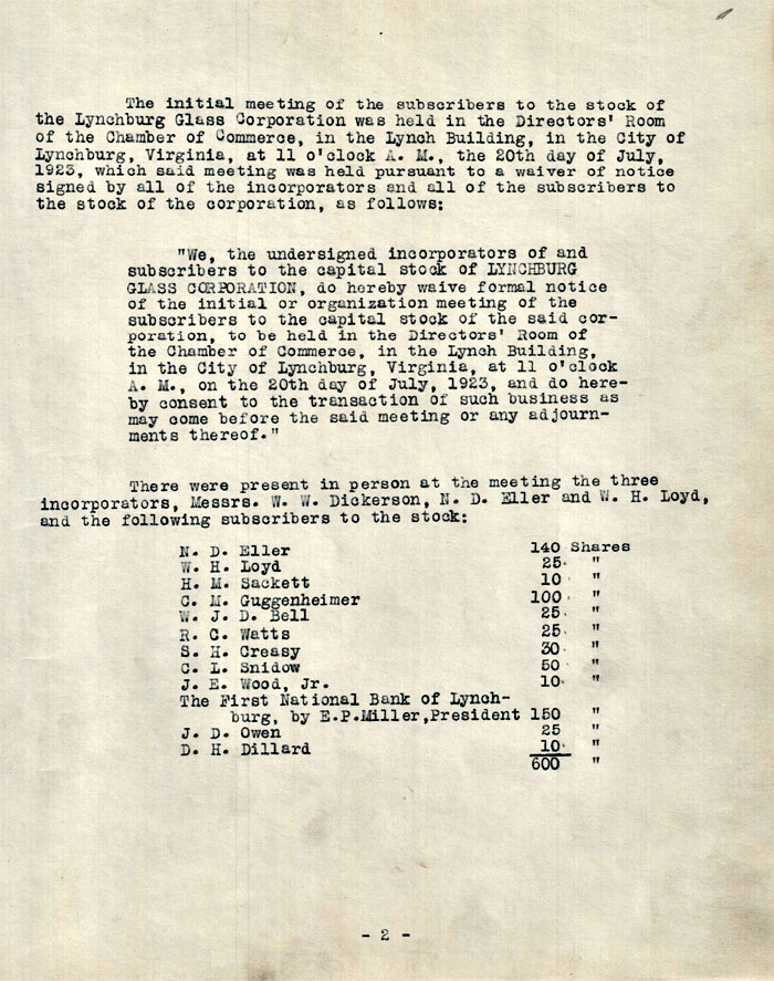 [p. 2] The initial meeting of the subscribers to the stock of the Lynchburg Glass Corporation was held in the Directors’ Room of the Chamber of Commerce, in the Lynch Building, in the City of Lynchburg, Virginia, at 11 o’clock A.M., the 20th day o[f] July, 1923, which said meeting was held pursuant to a waiver o[f] notice signed by all of the incorporators and all of the subscribers to the stock of the corporation, as follows: