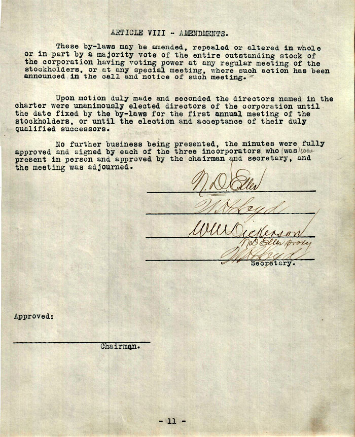 No further business being presented, the minutes were fully approved and signed by each of the three incorporators who was present in person and approved by the chairman and secretary, and the meeting was adjourned.