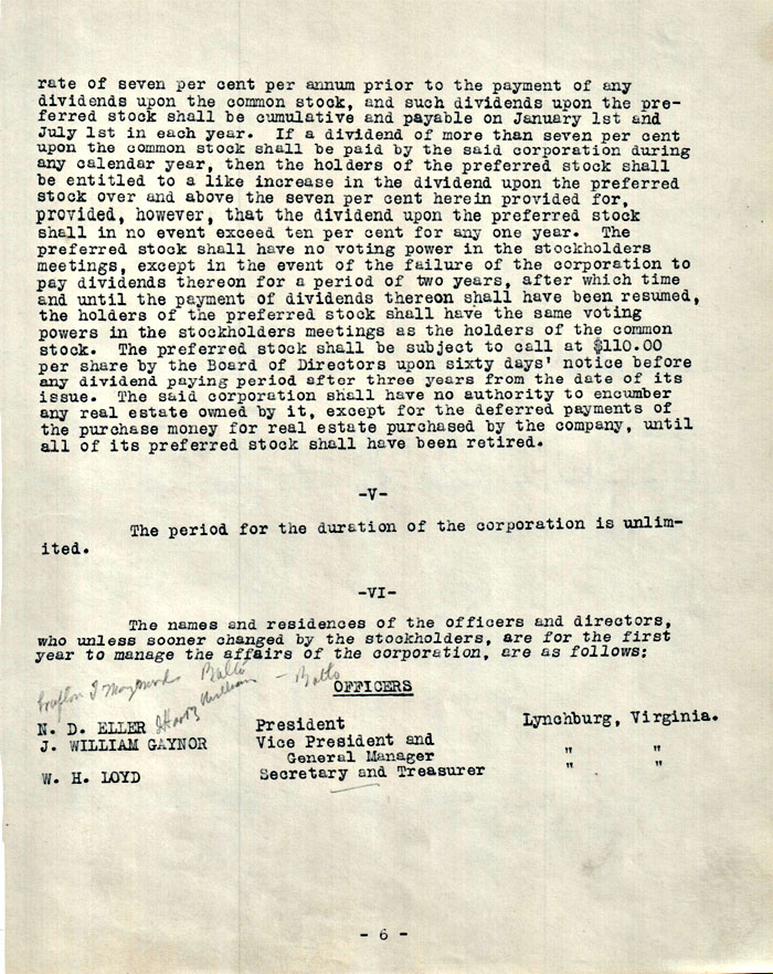 This was the first organizational meeting of the stockholders of the company held to approve the corporate charter. It includes a list of the subscribers to Common Stock, the only elgible voting members of the meeting. Page numbers reflect how the Minutes were originally organized for filing. The embossed seal on the first page is not part of the original document; it is the seal of the Jones Memorial Library in Lynchburg, VA., where the originals are kept.