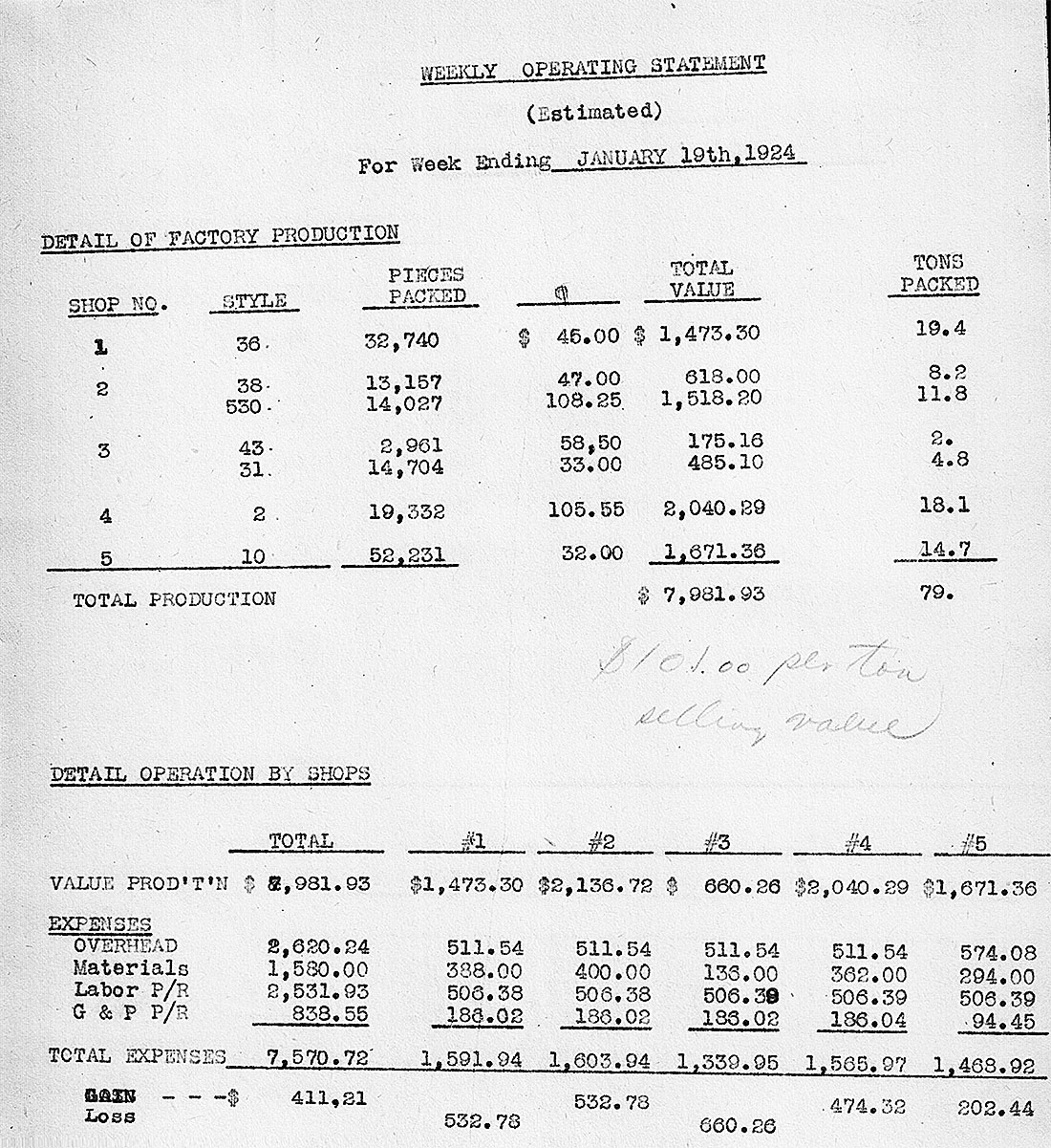 ** The Board had approved restarting the plant this week to produce insulators for which on hand supplies were low or exhausted. While no production records exist for this week, apparently insulators were made because on May 10, 1924 Mr. Gayner reported to the Board that on-hand stocks were complete. Minutes, May 10, 1924